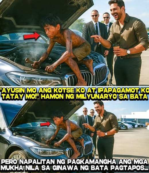 Napatingin si Don Ricardo sa mga mata ni Tomas. Sa kabila ng murang edad at maruming anyo, nakita niya ang tapang na hindi niya nakikita kahit sa mga lalaking nakapaligid sa kanya—isang tapang na wala sa posisyon o pera kundi galing sa pagmamahal sa pamilya. Napailing ang Don at napangisi. “Sige!” wika niya, halos mapaos ang tinig. “Subukan natin. Kung kaya mong paandarin itong kotse, gagamitin ko ang impluwensya ko para pag-aralan ang kaso ng tatay mo. Pero kapag pumalpak ka…” Tumigil siya sandali at tinitigan ang bata mula ulo hanggang paa. “…ikaw ang mapapahiya. Ikaw ang pagtatawanan ng lahat. At baka pati ang tatay mo lalo lang hindi makalabas sa kulungan.” Muling nagtawanan ang mga tao.