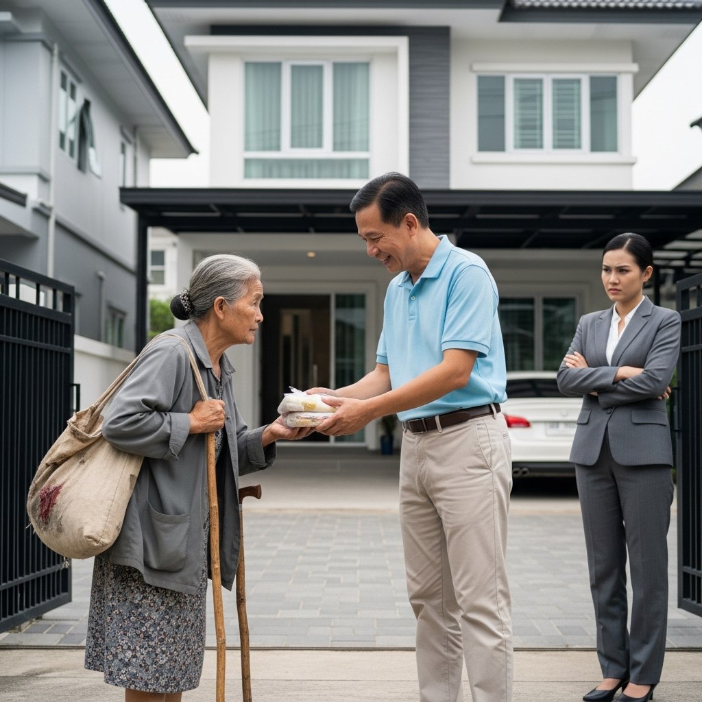 Kumuha siya ng isang supot ng instant noodles mula sa trunk ng kotse, inilagay ito sa kamay ng kanyang ina at marahang itinulak ito palabas ng gate.